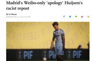 體育資訊02月23日訊 《環(huán)球時報》英文版網(wǎng)站發(fā)文報道了赫伊森轉(zhuǎn)發(fā)辱華內(nèi)容的事件,文章的標(biāo)題為《中國球迷對皇馬僅在微博發(fā)布的"道歉"表示不滿,此前赫伊森轉(zhuǎn)發(fā)種族歧視內(nèi)容》。