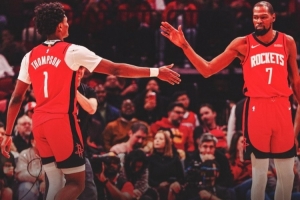 賽后,火箭官方曬出本場贏球海報(bào),封面為杜蘭特與阿門·湯普森的擊掌瞬間。