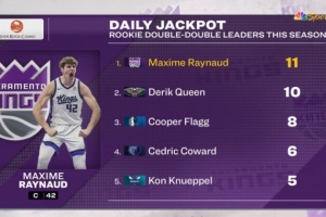國王42號秀雷諾再次拿到兩雙,超過鵜鶘新秀奎因,兩雙次數(shù)躍升為本屆新秀第一。