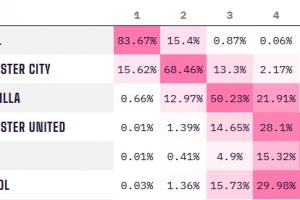 爭冠集團方面,阿森納贏下北倫敦德比后,奪冠概率回升至83.67%,曼城則是15.62%。維拉有高達50.23%的概率在賽季末排名第三。