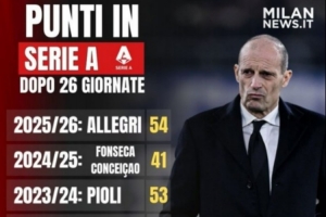 體育資訊2月24日訊 本賽季AC米蘭在前26輪意甲過后積分54分,此數(shù)據(jù)比上賽季同期提升明顯,以下為近幾個(gè)賽季AC米蘭在26輪后同期積分情況: