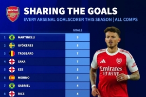 阿森納本賽季16人取得進球: