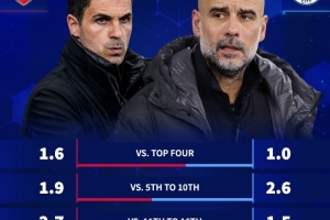 體育資訊2月25日訊 在多賽一場(chǎng)的情況下,英超領(lǐng)頭羊阿森納目前僅領(lǐng)先位居次席的曼城5分。如今,英超冠軍之中越來越激烈。德國轉(zhuǎn)會(huì)市場(chǎng)盤點(diǎn)了兩隊(duì)面對(duì)其他英超球隊(duì)時(shí)的積分情況。