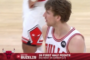 上半場比賽,公牛前鋒布澤利斯扛起球隊進攻大旗,進攻端里突外投效率不錯,他出戰(zhàn)18分鐘,12中7,三分6中2拿到16分4籃板1搶斷。