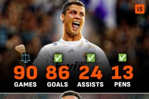 Livescore對比了C羅與姆佩巴兩人加盟皇馬前90場的數(shù)據(jù):其中C羅打進84球24次助攻,主罰點球13次,而姆巴佩打進82球,貢獻10助攻,罰點19次。