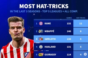 德轉列出五大聯(lián)賽球員最近三個賽季在各項賽事戴帽次數(shù)榜,瑟爾洛特與哈蘭德5次并列第三,凱恩11次居首。