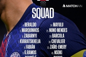 中場:8-法比安、17-維蒂尼亞、24-馬尤盧、33-扎伊爾·埃梅里、45-恩索基