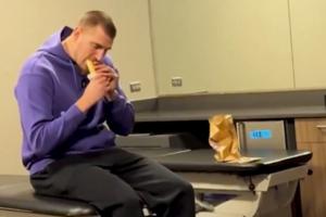 在視頻中,約基奇首先說道“因?yàn)槟莻€(gè)(選秀廣告)我從不吃Taco Bell。”鏡頭一轉(zhuǎn),是他在更衣室悠閑品嘗卷餅一幕。