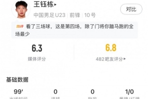 體育資訊1月17日訊 U23亞洲杯1/4決賽,國足vs烏茲別克斯坦,王鈺棟為U23國足首發(fā)出戰(zhàn),加時賽第9分鐘因體力耗盡被換下,最終獲評6.3分。