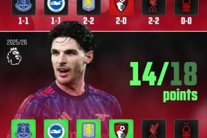 據AFTV統(tǒng)計,阿森納近六輪英超拿到了18個積分中的14分,相比上賽季相同的六場比賽,多拿了9個積分。