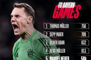 體育資訊1月19日訊 拜仁官方曬出海報(bào),諾伊爾為球隊(duì)584次出場(chǎng)已經(jīng)追平貝肯鮑爾并列第5,具體榜單如下:
